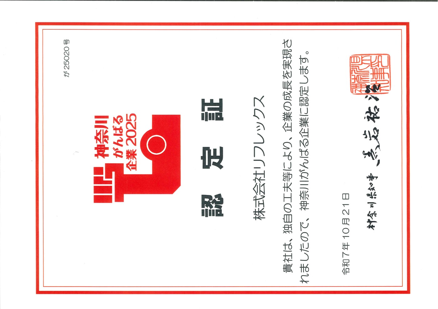 昨年に引き続き、神奈川県より「神奈川がんばる企業」に認定されました。 当社の取り組みと従業員の努力を評価いただき、誠に光栄に存じます。